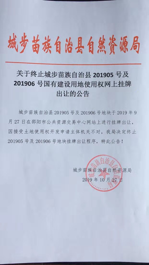 城步苗族自治县自然资源局--关于终止城步苗族自治县201905号及201906号国有建设用地使用权网上挂牌出让的公告