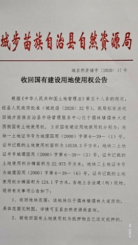 收回国有土地使用权公告 城自然资储字[2020]17号 市场管理服务中心