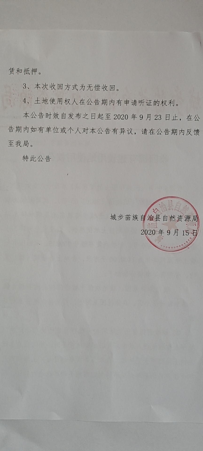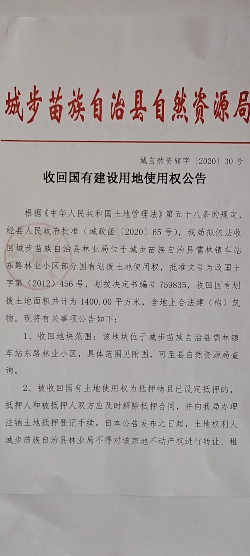 城步苗族自治县自然资源局收回国有建设用地使用权公告 城自然资储字【2020】30号
