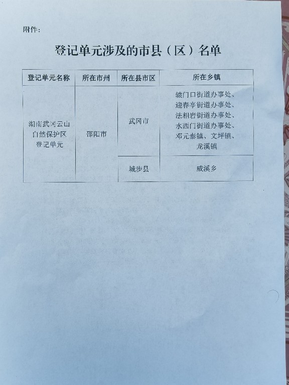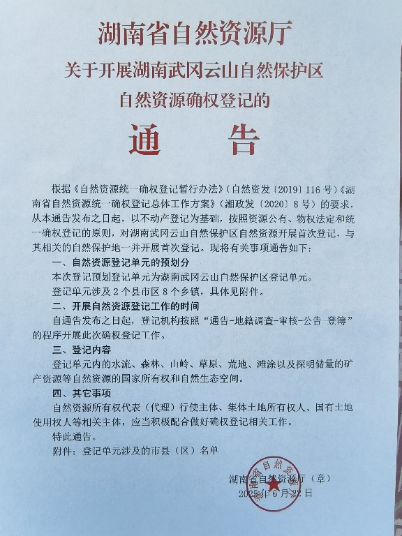 湖南省自然资源厅关于开展湖南武冈云山自然保护区自然资源确权登记的通告