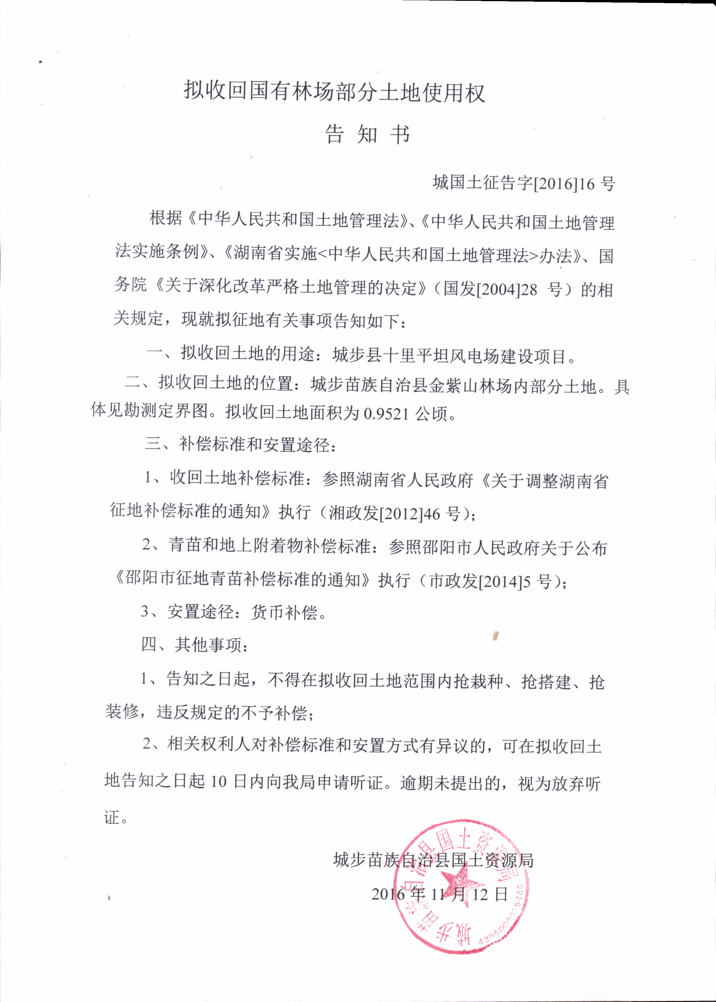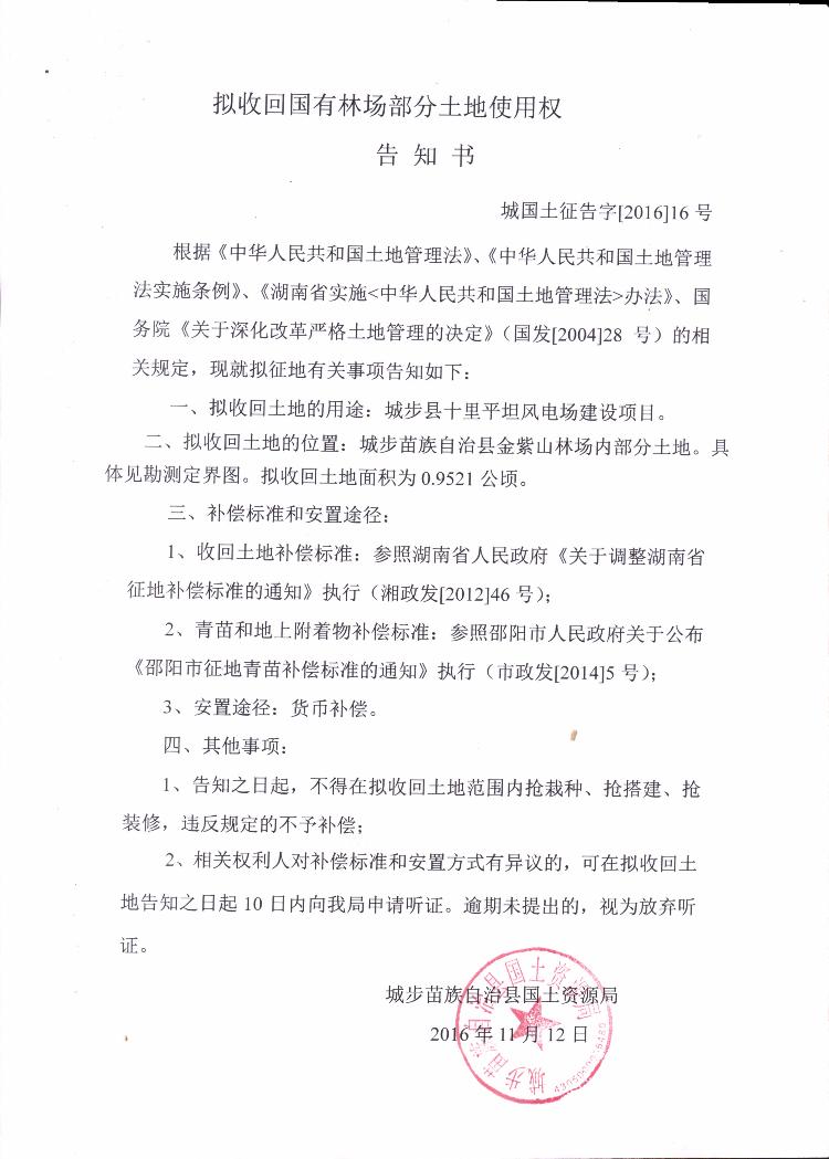拟收回国有林场部分土地使用权告知书