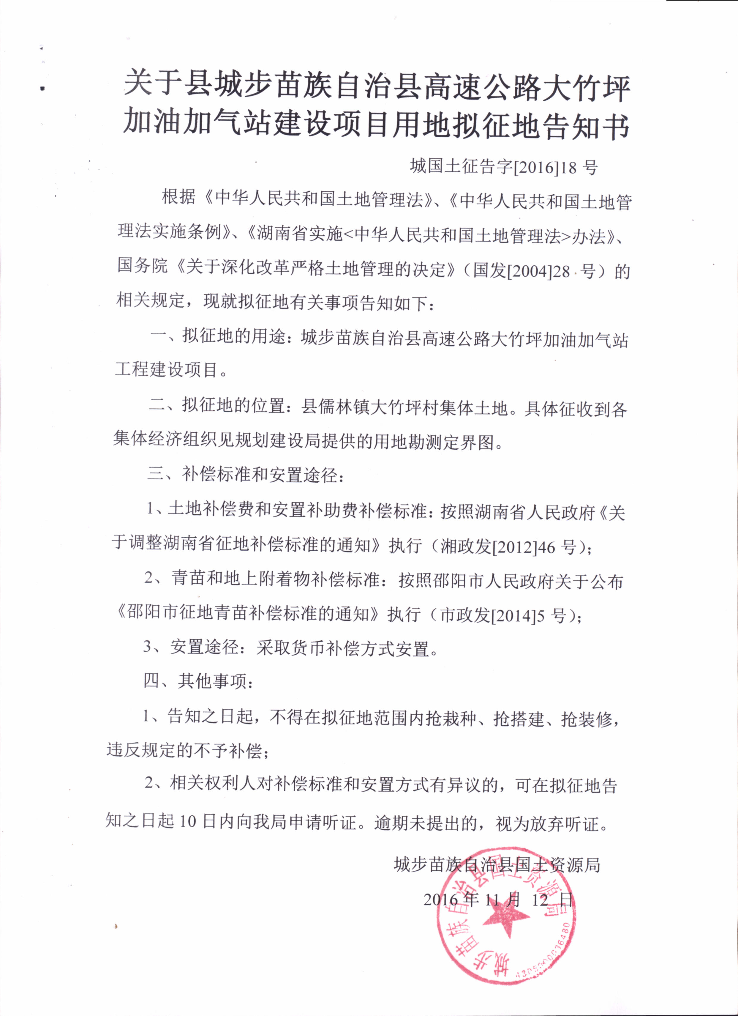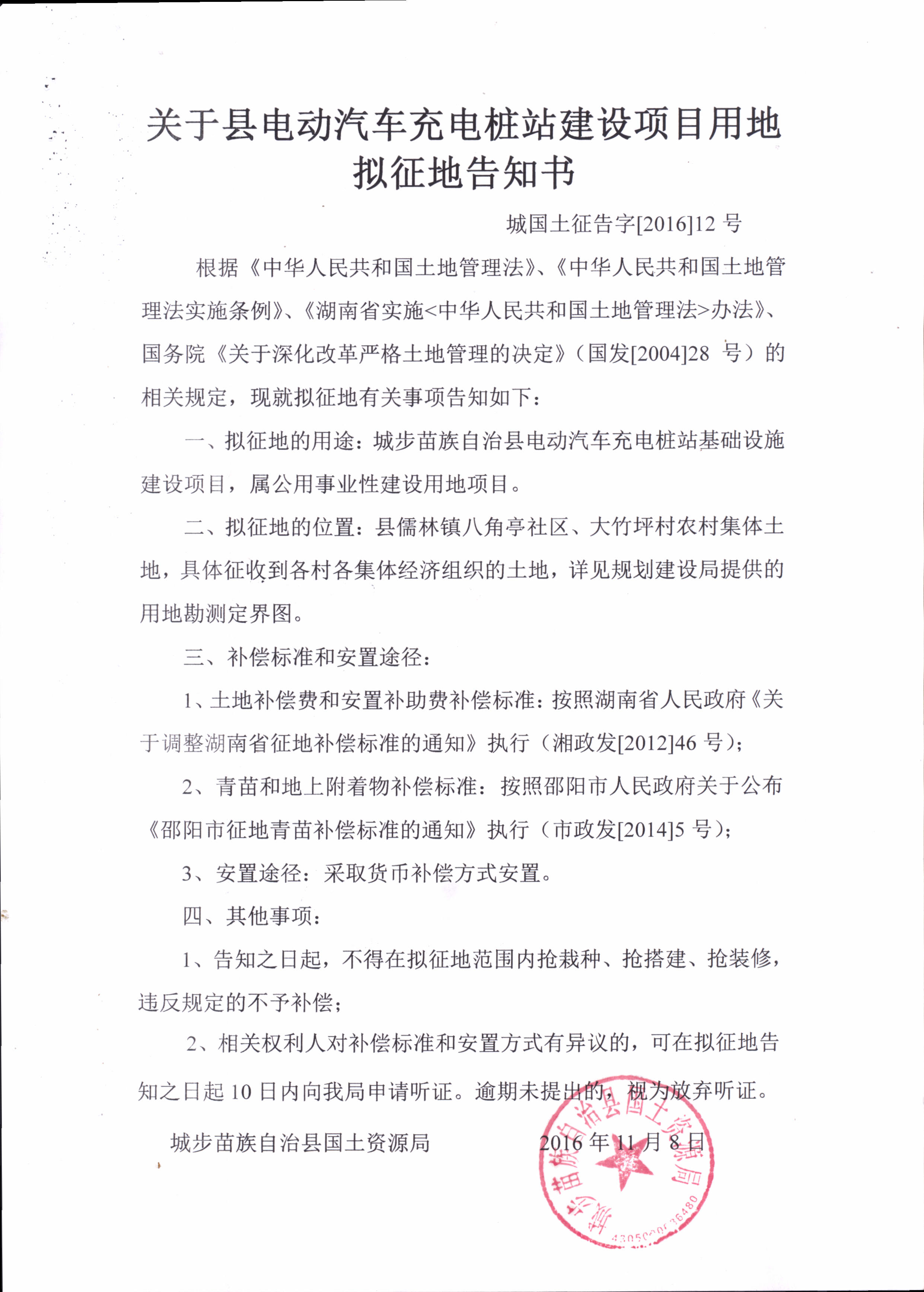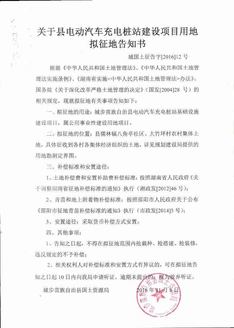 关于县电动汽车充电桩站建设项目用地拟征地告知书