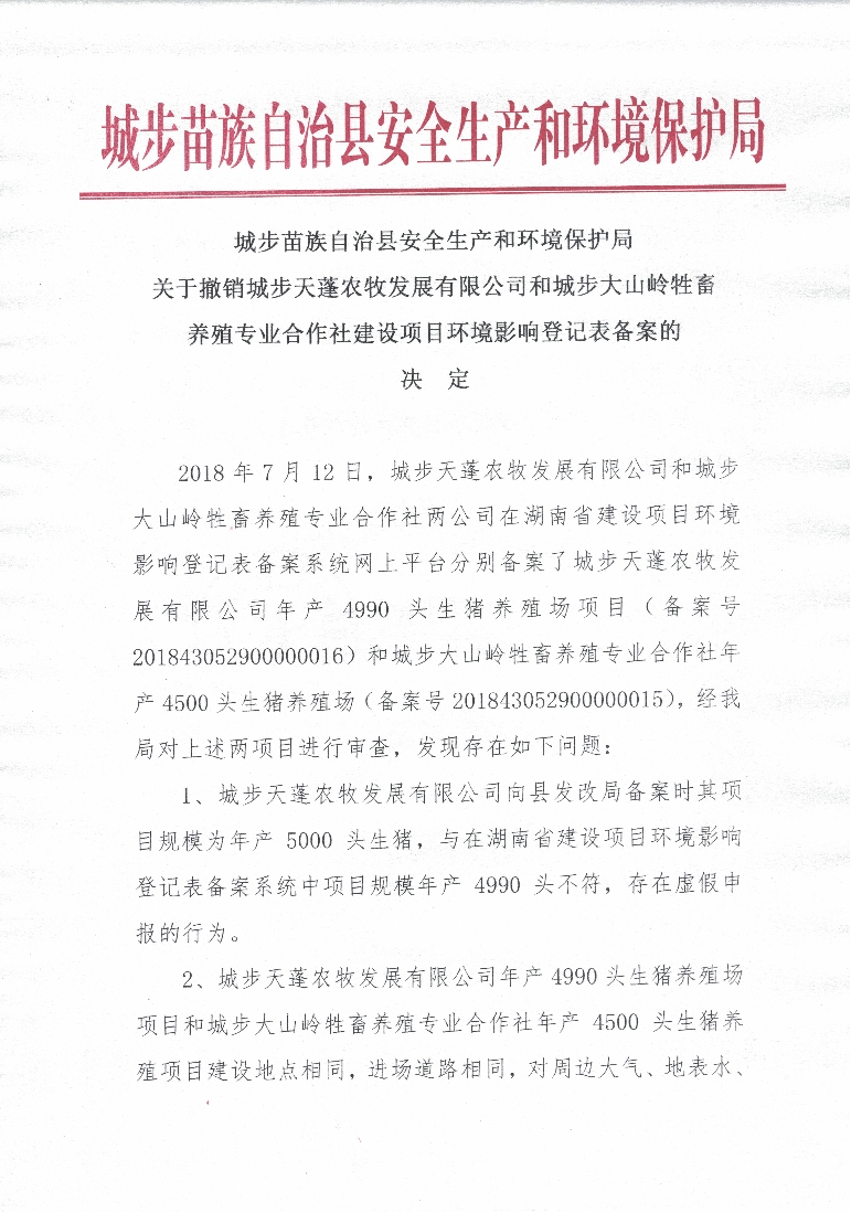 关于撤销城步天蓬农牧发展有限公司和城步大山岭牲畜养殖专业合作社建设项目环境影响登记表备案的决定