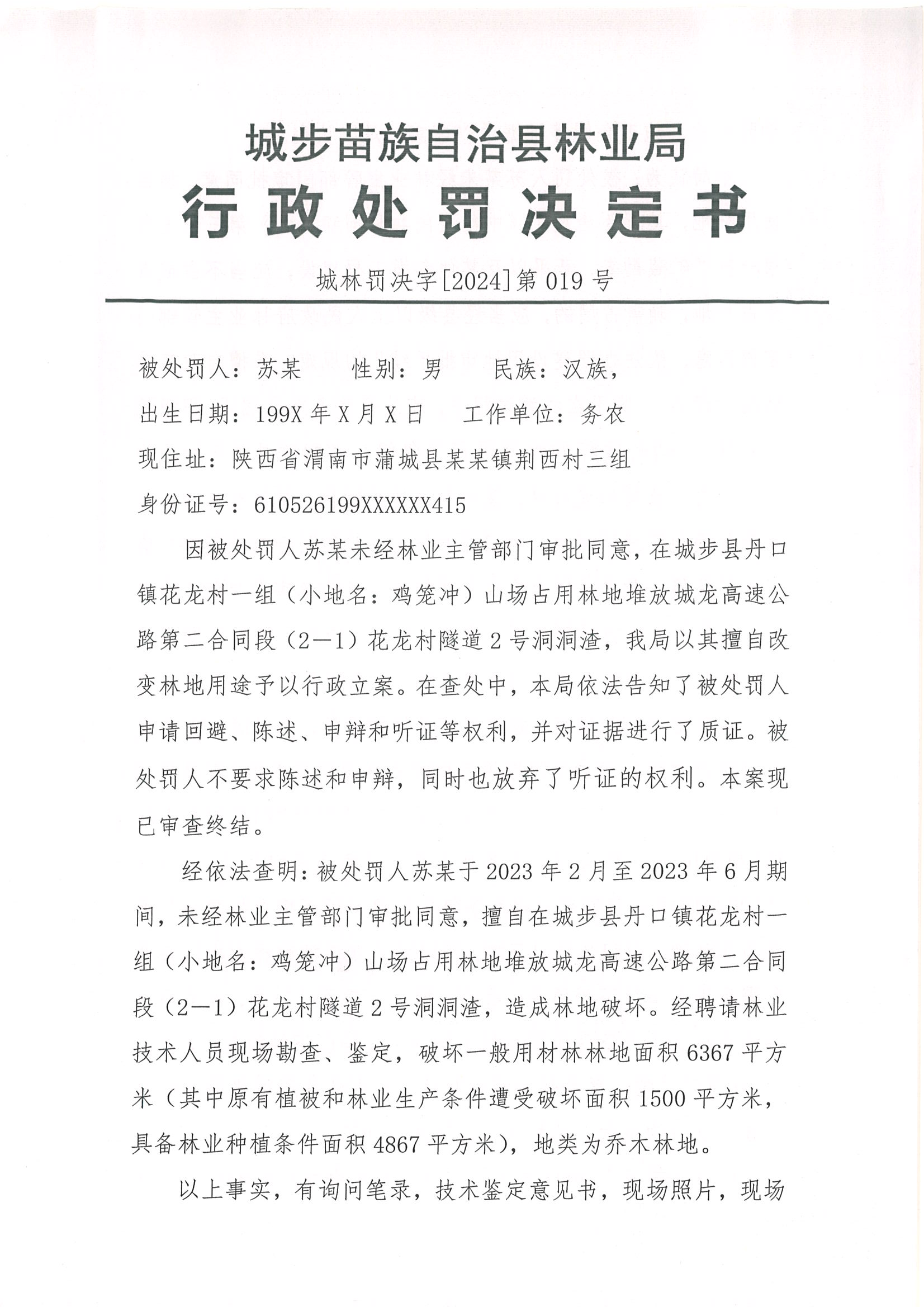 城林罚决字﹝2024﹞第019号