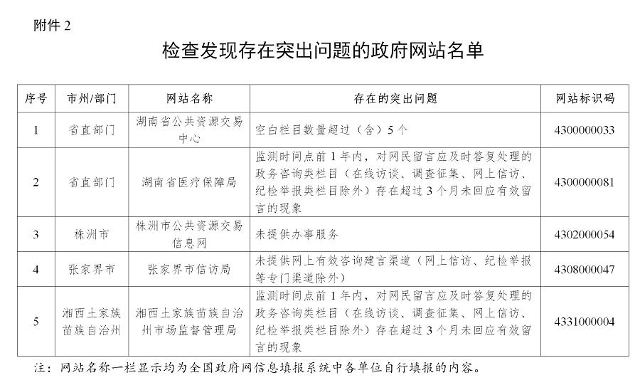 (一)个别网站功能建设不到位。湖南省公共资源交易中心网站存在空白栏目数量超过(含)5个问题;株洲市公共资源交易信息网网站未提供办事服务功能;张家界市信访局网站未提供网上有效咨询建言渠道。
