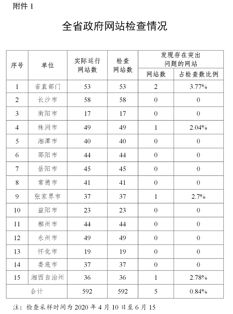 2020年第二季度,省政务局组织对全省正常运行的592家政府网站进行全覆盖检查,发现5家存在突出问题,总体合格率99.16%,其中长沙市、衡阳市、湘潭市、邵阳市、岳阳市、常德市、益阳市、郴州市、永州市、怀化市、娄底市网站检查合格率100%;对全省正常运行的1851家政务新媒体进行普查,发现31家存在突出问题,总体合格率98.33%,其中长沙市、湘潭市、常德市、郴州市、怀化市、娄底市政务新媒体检查合格率100%。