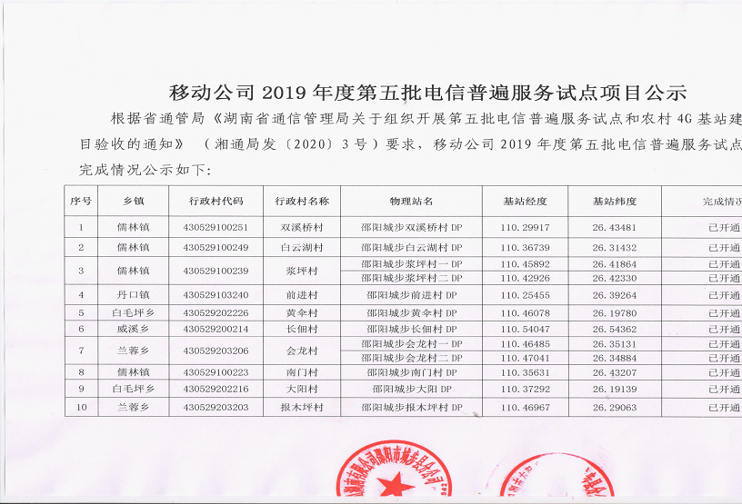 移动公司2019年度第五批电信普遍服务试点项目公示