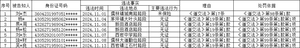 下列被告知人(见附表)在城步苗族自治县实施道路交通安全违法行为,被我大队依法查获并开具《公安交通管理行政强制措施凭证》或《道路交通安全违法行为处理通知书》。因被告知人无正当理由逾期未接受处理,我大队根据《湖南省实施<中华人民共和国道路交通安全法>办法》第四十六条第二款的规定,按照备案信息中的联系方式,通过邮寄《行政处罚告知书》等方式将拟作出的行政处罚决定的事实、理由、依据以及依法享有的权利予以告知,但被告知人未在告知后30日内接受处理,现采取公告方式告知拟作出行政处罚决定的事实、理由、依据、依法享有的权利,公告期为7日。公告期内,被告知人有提出陈述、申辩的权利,处吊销机动车驾驶证或单个违法行为较大数额(2000元以上)罚款的有要求听证的权利。需要陈述、申辩、听证的,应当自本公告发布之日起7日内向城步公安局交警大队依法提出,逾期未提出的,视为放弃陈述、申辩和听证权利,公安机关交通管理部门将根据调查的证据依法作出行政处罚决定。