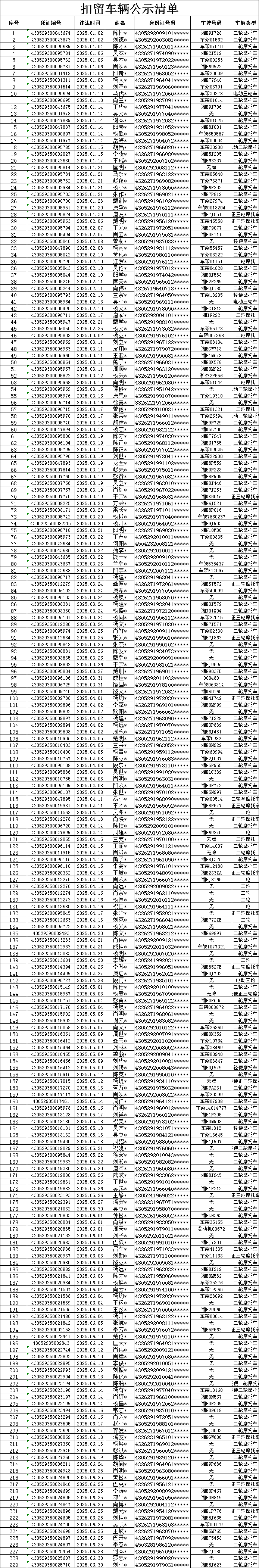 根据《中华人民共和国道路交通安全法》第一百一十二条、《道路交通安全法实施条例》第一百零七条之规定,被扣留的机动车,驾驶人或者所有人、管理人30日内没有提供被扣留机动车的合法证明,没有补办相应手续,或者不前来接受处理的,经公安交警部门通知并且经公告3个月内仍不前来接受处理的,由公安机关交警部门对该机动车依法进行处理。现我大队依法对以下机动车2025年1月1日至6月30日被扣留的进行公告(车辆详情见附件),请机动车驾驶人或者所有人、管理人自公告起3个月内提供被扣留机动车的合法证明到城步苗族自治县公安局交通警察大队接受处理,逾期未处理的机动车将按规定依法进行处理。