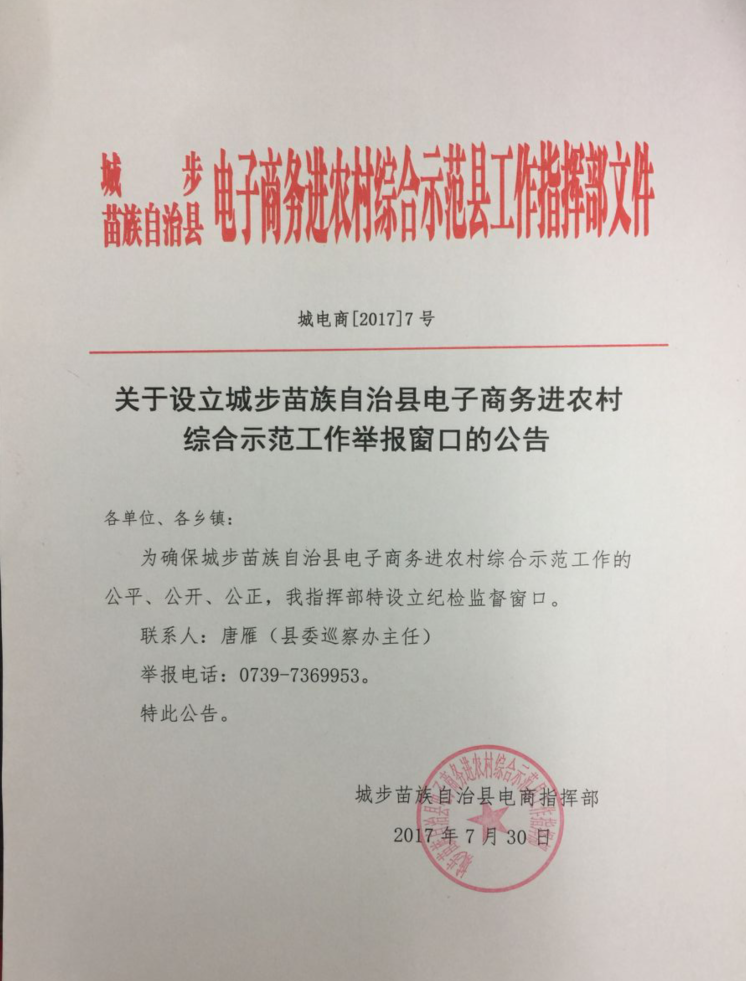 关于设立城步苗族自治县电子商务进农村综合示范工作举报窗口的公告