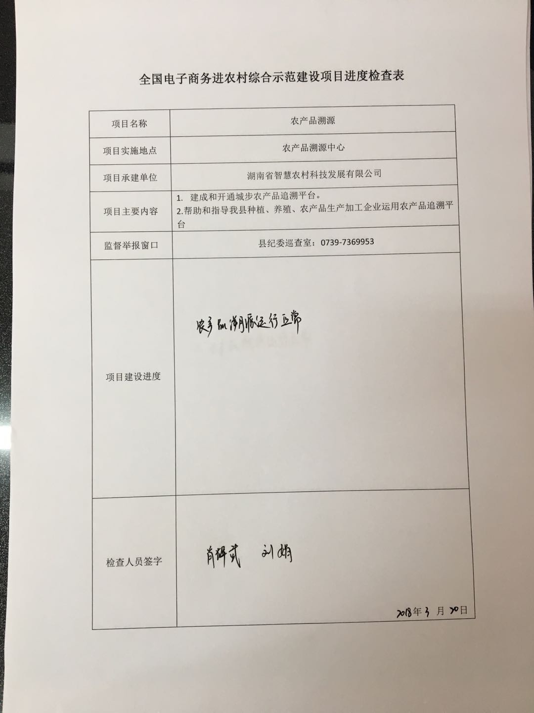 农产品溯源2018年3月项目进度检查表