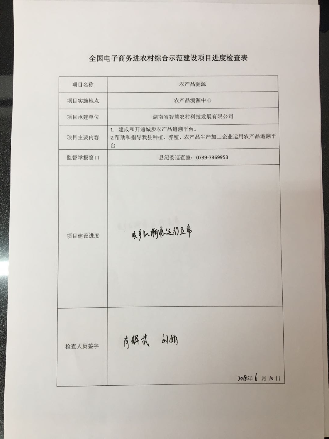 农产品溯源2018年6月项目进度检查表