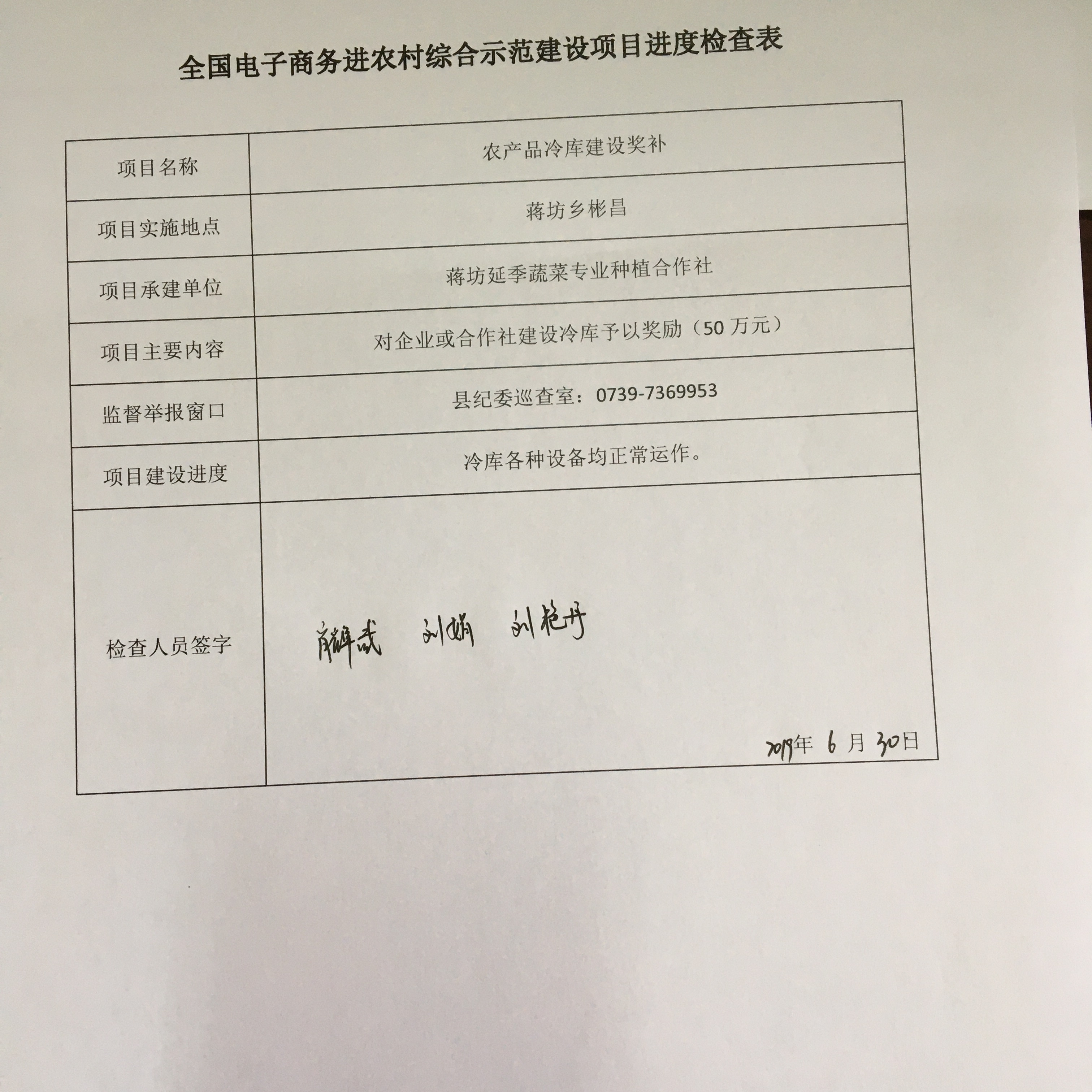 农产品冷库建设项目6月进度检查表