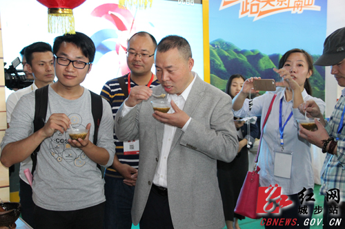 省旅游局党组成员、副局长高扬先(中)巡馆时品尝苗乡油茶