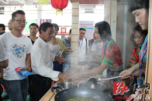 红网城步站10月19日讯(记者刘令 通讯员饶立旺) 锦绣潇湘,乐游世界。10月16至18日,2015湖南(第六届)旅游休闲博览会(简称“湖南旅博会”)在长沙红星国际会展中心隆重举办。国内外600余家旅游机构参展,1000余条(个)国内外热门旅游线路及旅游目的地在现场展示与促销,我县共组织13家单位共30余个特色产品参展。展会期间城步场馆人气爆棚, 市民排队争相品尝苗家油茶、青钱柳茶、虫茶,购买南山牛奶、炭雕、贡椒酱等特色旅游休闲产品,询问城步旅游景点情况,踊跃参与专场推介会互动。县委副书记蔡灿辉,县委常委、宣传部长曾伟子到场指导,省旅游局党组成员、副局长高扬先在巡视中充分肯定了我县参展工作,并且品尝了苗家油茶。