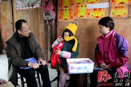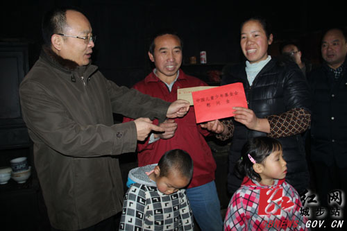 中国儿童青少年基金会秘书长朱锡生一行在大寨村贫困学生蒙敏锐家看望慰问。肖丁勤摄