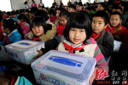 红网城步站1月13日讯(记者肖丁勤)1月12日,天寒地冻,城步苗族自治县长安营镇民族中心学校却洋溢着欢乐的气氛,546位学生每人领到一件“HELLO小孩”爱心套餐。当天,中国儿童少年基金会携手安利公益基金会在城步开展爱心助学活动,为长安营民族中心学校、资源中心学校、南山中心学校、白云中心学校送去总价值40万的1000个爱心套餐包。融融爱意似温暖春风,吹进了这些偏远山村孩子们的心里。