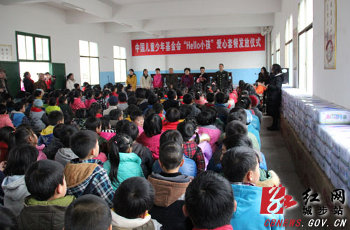 长安营镇546名学生每人得到一份“HELLO小孩”爱心套餐包。肖丁勤摄