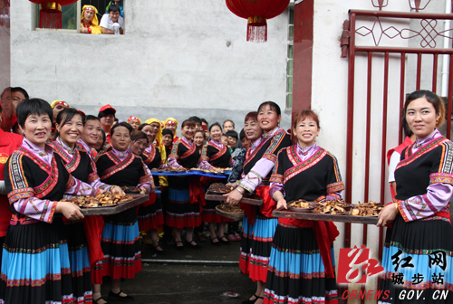 红网城步站5月9日讯(记者肖丁勤)吊龙舞起来,山歌唱起来,摇摇舞跳起来……5月7日,城步苗族自治县蒋坊乡的千年古村――铺头沉浸在欢乐的海洋中,上千名游客流连于古巷深宅里,观古色古香的明清古建筑,看重现江湖的民间手工艺,尝流传千年的苗家合喜饭,风情万种的神秘铺头村让游客赞叹不已。县人民政府副县长陈小兵,市旅游外事局调研员彭焕然,邵阳学院民俗专家李坚、唐文林出席当天的旅游考察活动。