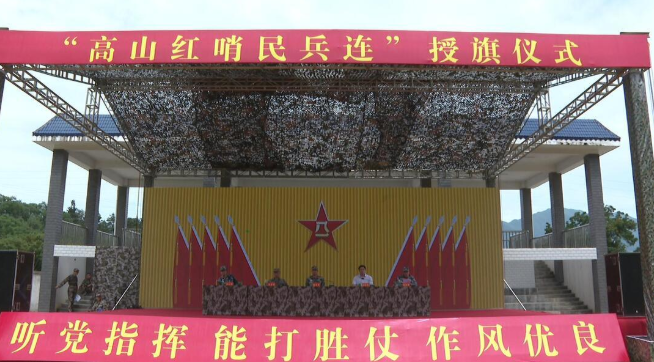 授旗仪式在奏唱《中国人民解放军军歌》中拉开序幕,宣读了关于成立高山红哨民兵连的批复,诸葛军向高山红哨民兵连授旗。