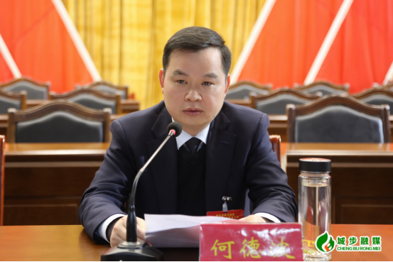 图为县委书记何德波在会上讲话