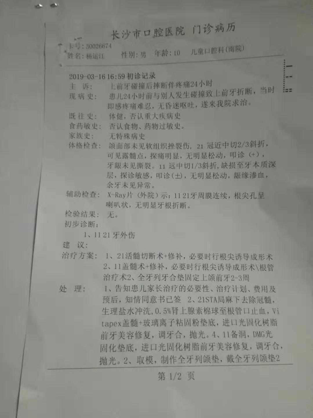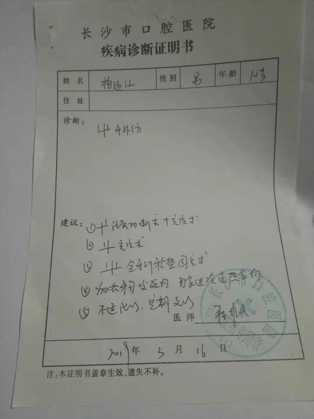 | 内容: | 2019年3月15日下午2时许,南山实验学校在校生杨运江在校期间玩耍时因同学梁子贤的突然阻挡摔倒在地,致两上门牙断裂。16日于长沙市口腔医院补牙,但成年后需重新种牙仍需一大笔医疗费用。在与校方及当事学生家长的协商后,校方认为自身无责;当事学生也表示无伤害动作,其监护人拒绝赔偿;在校保险也不能报销,但是校方既不拿出参保凭证也没有任何保险的理赔内容。 我们认为:1、学校安全教育及对学生保护的缺失间接导致该学生在校期间受到伤害,应负连带责任;2、尽管对方否认有伤害性动作,但经在场学生的多次确认,其确有伤害性动作,其监护人应负主要责任;3、校方不能出示保险的凭证,保险公司口头断言牙齿损伤不在参保范围内,我们对保险的内容和合理性存在疑问。 诉求:1、调查此次事件的经过,划分责任;2、对于在校生的保险内容提供说明并由校方出示购险凭证。 学生的身心健康是广大家长的殷切希望,也是国家教育发展的基本要求,希望县长信箱能帮我们解决这个问题! 附件1:uploadfiles/201903/20190320100118611.jpg 附件2:uploadfiles/201903/20190320100127526.jpg 附件3:uploadfiles/201903/20190320100140608.jpg 附件4:uploadfiles/201903/20190320100201239.jpg 附件5:uploadfiles/201903/20190320100207935.jpg |